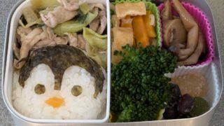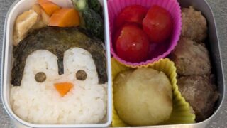子どもの中でブームがきている🐧のお弁当です。さつまいも(焼き芋)をラップで包んで丸めたのが甘くて予想外に高評価でした🍠