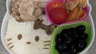 キャラ弁キャラ弁 2025年7月その2 キティちゃん型のお弁当箱にキティちゃんおにぎりを詰めました。リボンは鋏で作るので手間でしたが、他はのりパンチで作成できるので海苔の準備は簡単です✨子どもが黒豆が好きなので結構な頻度で入れちゃっています😅 2025.07.07キャラ弁