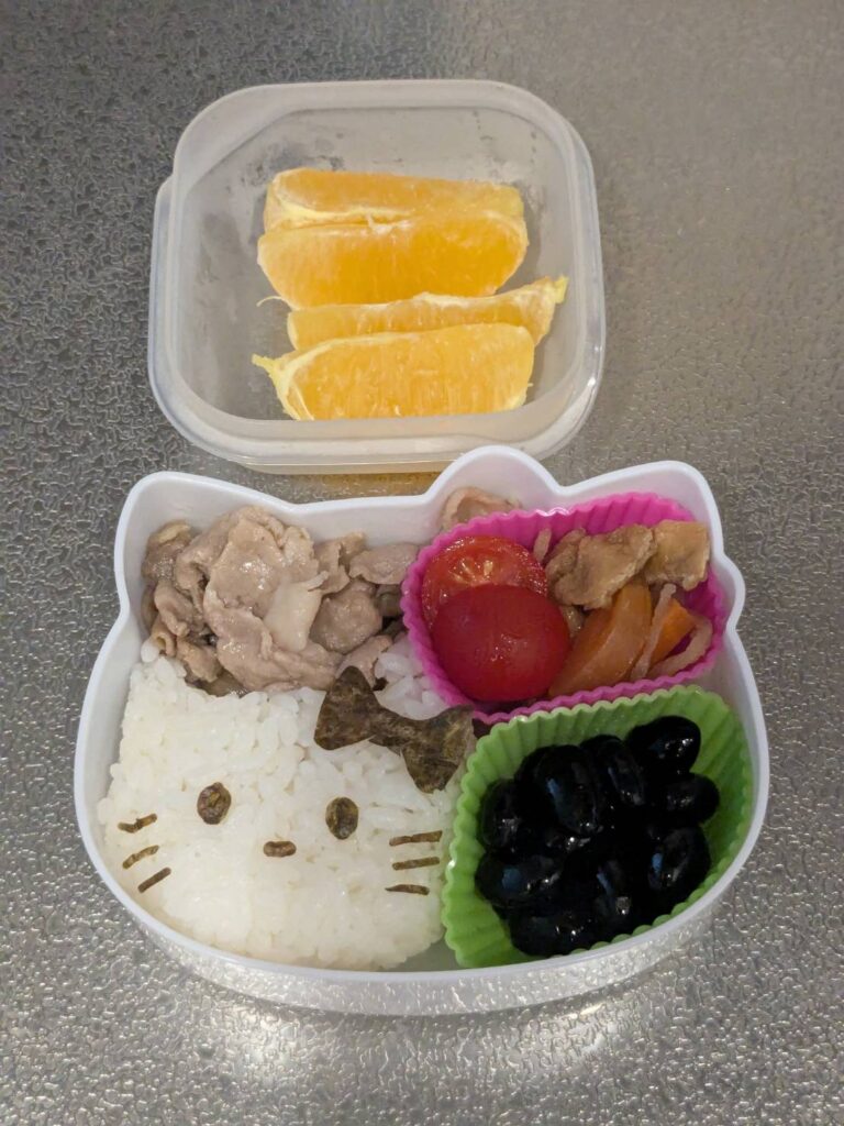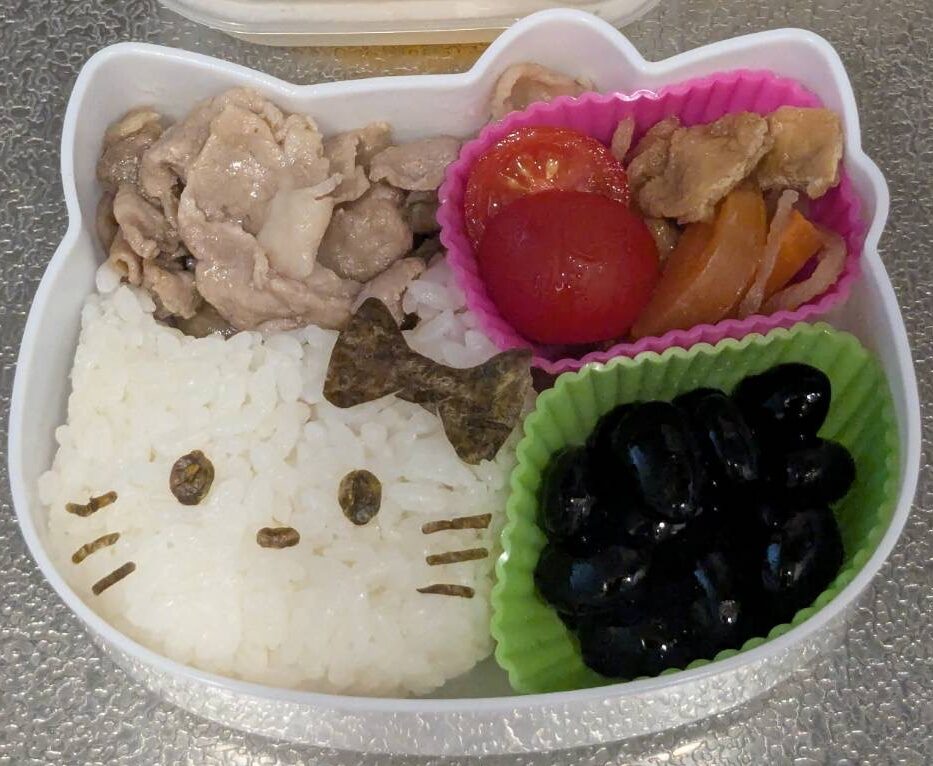 キティちゃん型のお弁当箱にキティちゃんおにぎりを詰めました。