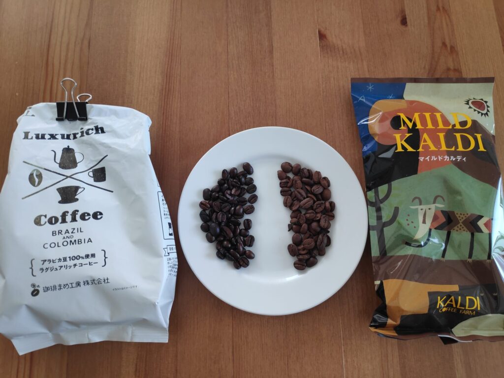 ラグジュアリッチ(白)はマイルドカルディと比較すると煎りが深く、豆の色が暗めですね。