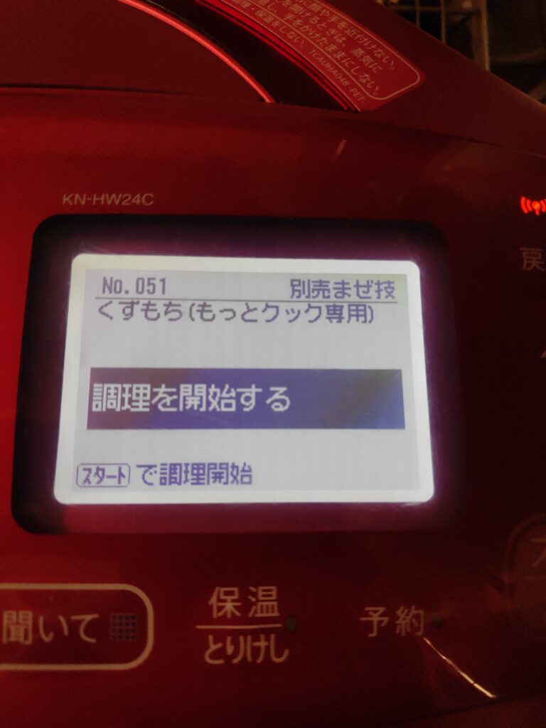 メニューを選ぶ → カテゴリーで探す → オプションメニュー → 別売アクセサリー → 別売アクセサリーメニュー → くずもち(もっとクック専用) → 調理を開始する → スタート